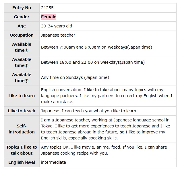 - After we receive your application, we'll ask you some questions and try to introduce you our Japanese members(language partner's candidate) who fit your needs.